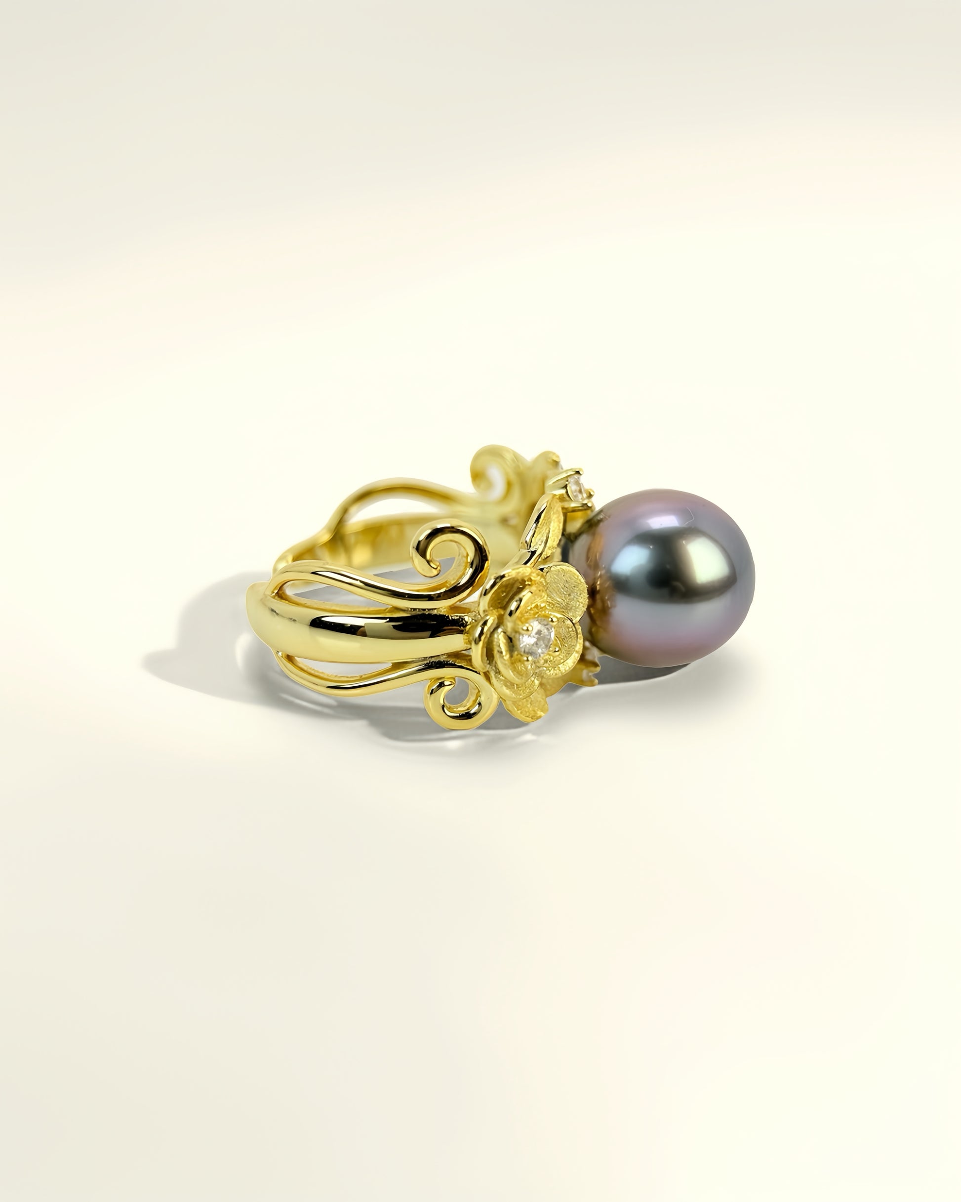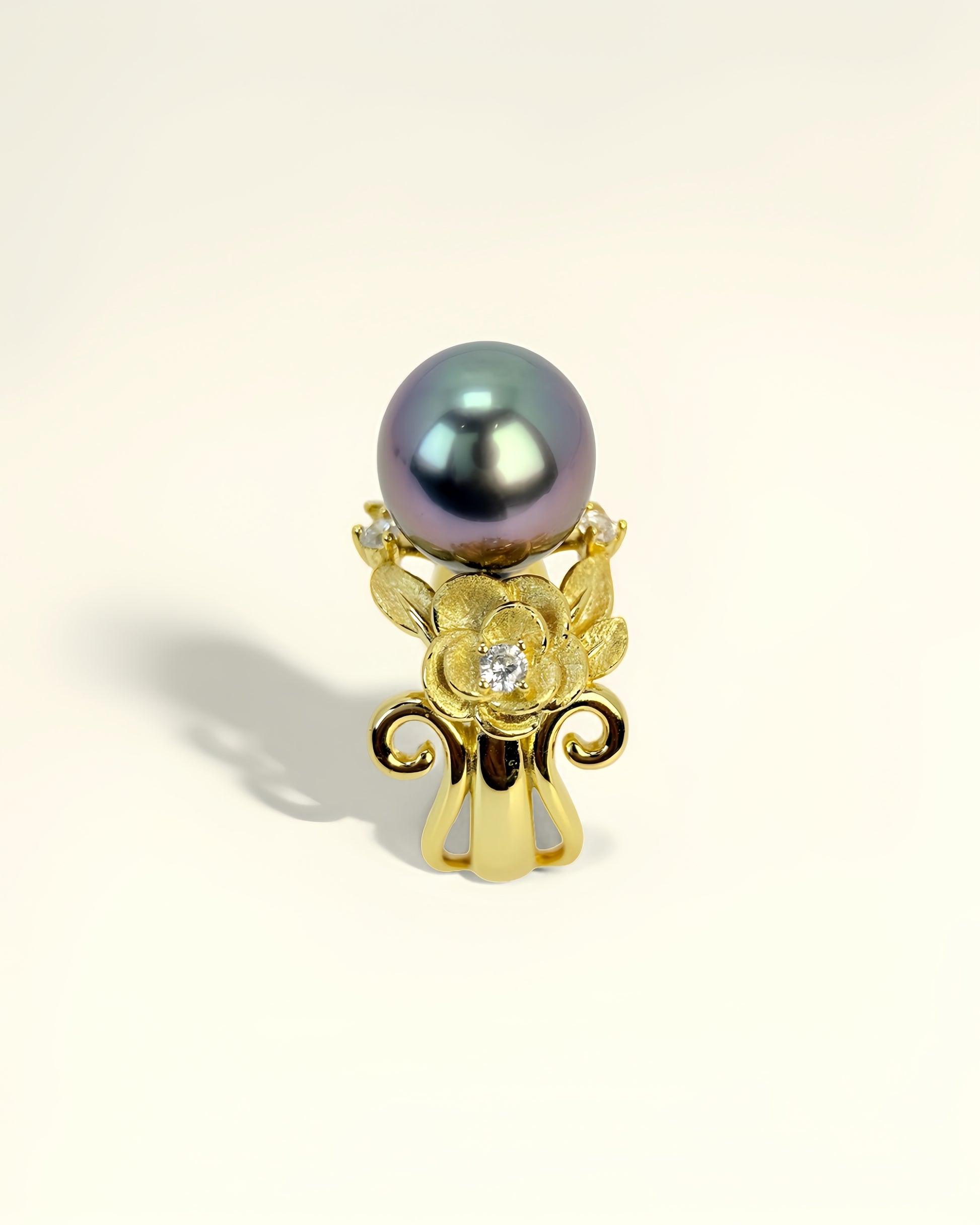 Centred by a 10.6mm natural Tahitian pearl with violet and grey overtones, it glows with the tender light of a rose at dusk. Zirconia accents bloom like crystalline petals, capturing both fragility and eternal beauty.