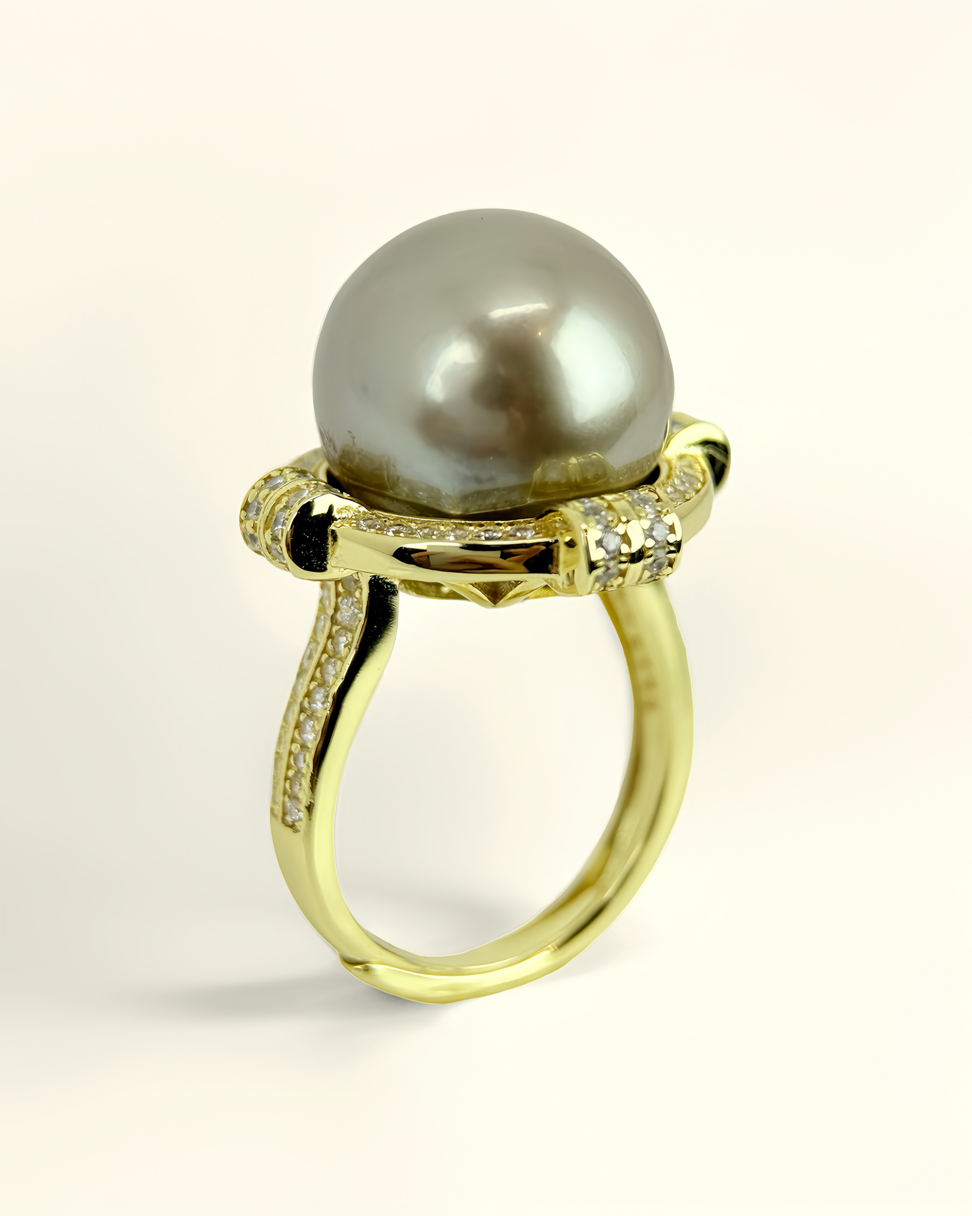 The setting is sculpted in 925 sterling silver plated with 18K gold, a refined structure that frames the pearl in warm brilliance. The golden radiance evokes the sun’s eternal power, lending the ring a sense of grandeur and divine vitality.