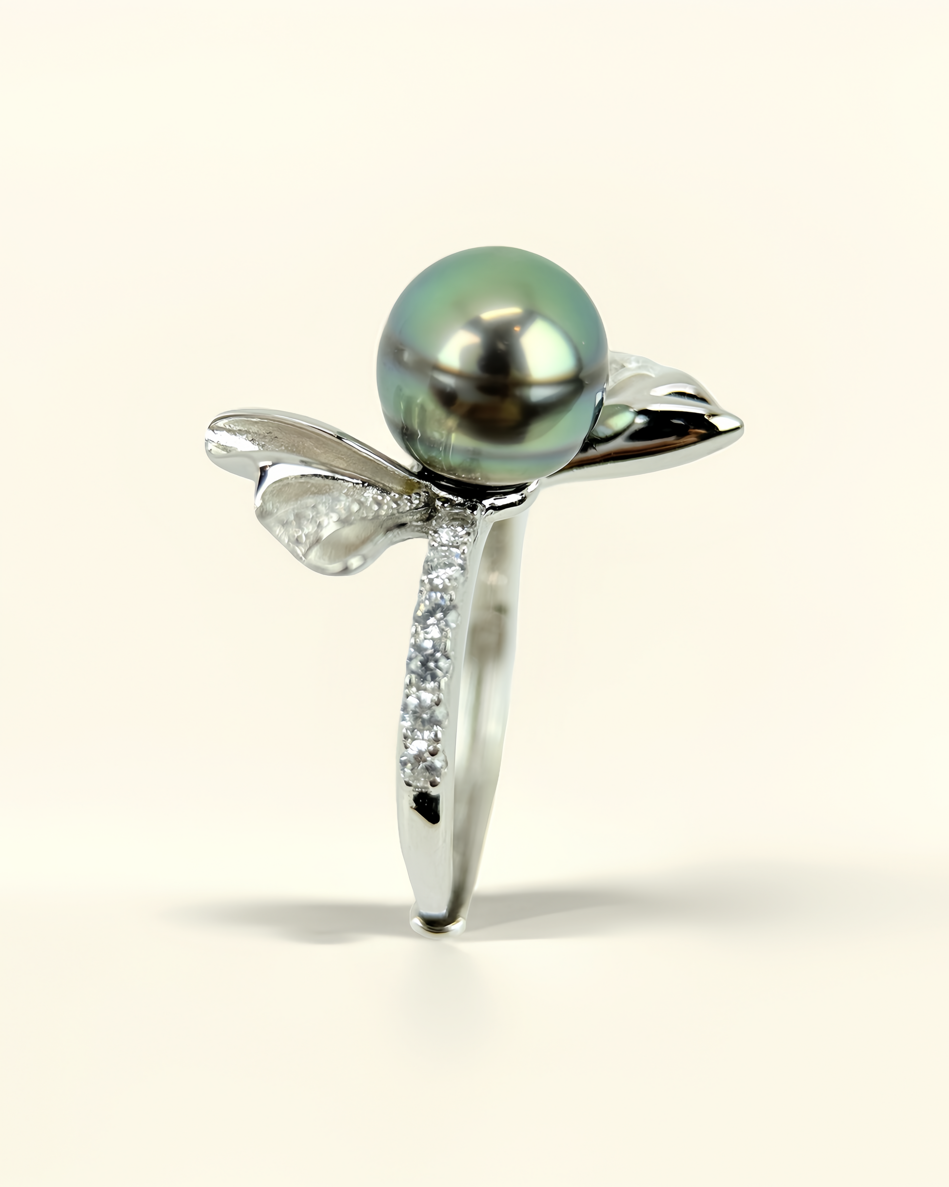At its heart rests a 9.0 mm natural Tahitian pearl, luminous in shifting tones, glowing like a secret kept between dream and reality.
