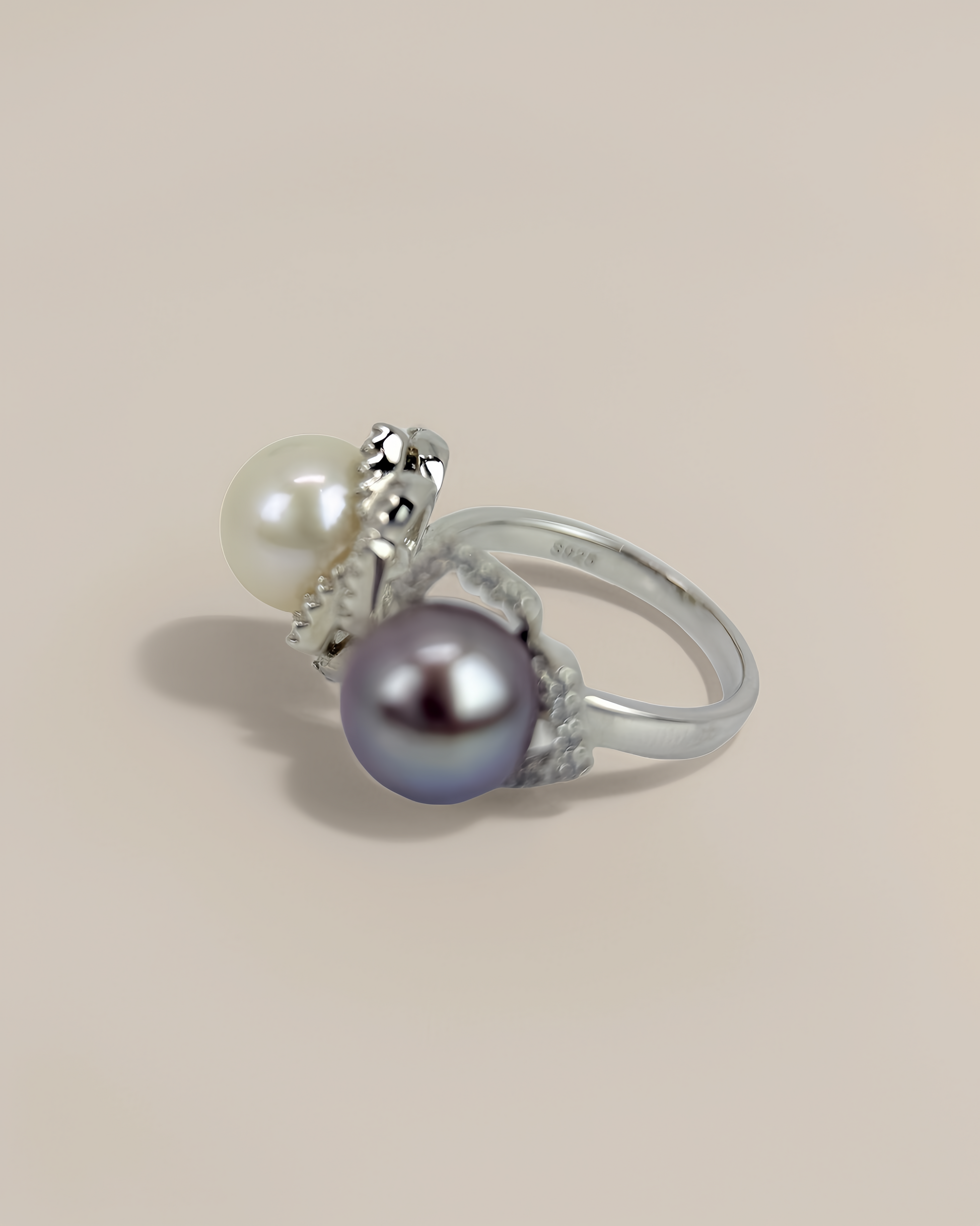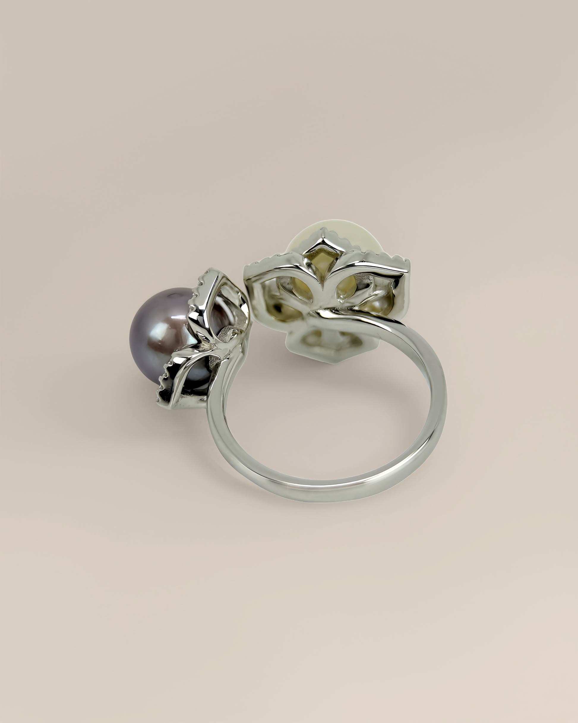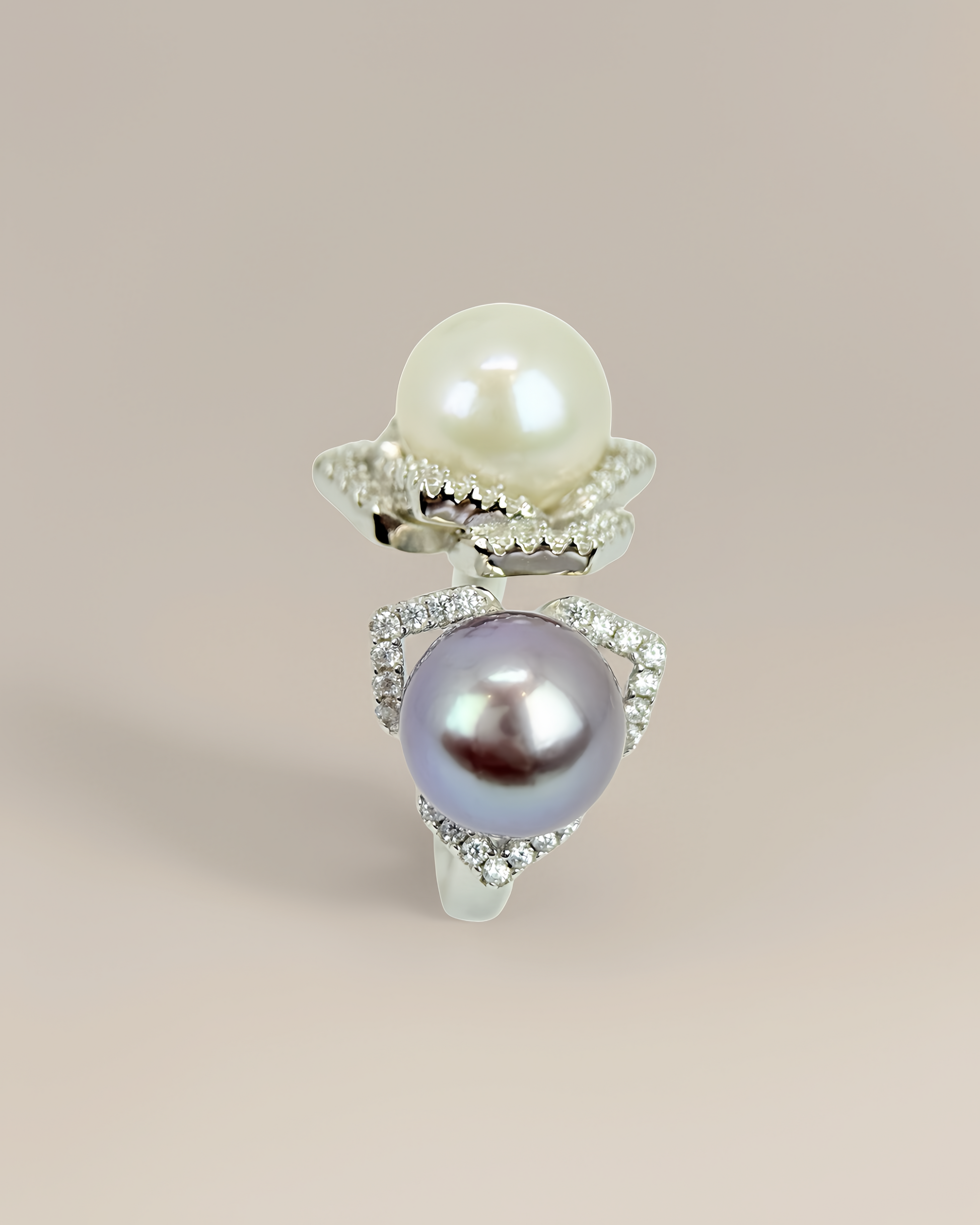 Two freshwater pearls — one a luminous 10.5mm white pearl, the other a 10.2mm pearl in soft violet-grey — bloom side by side like twin roses, embodying the balance of purity and mystery.