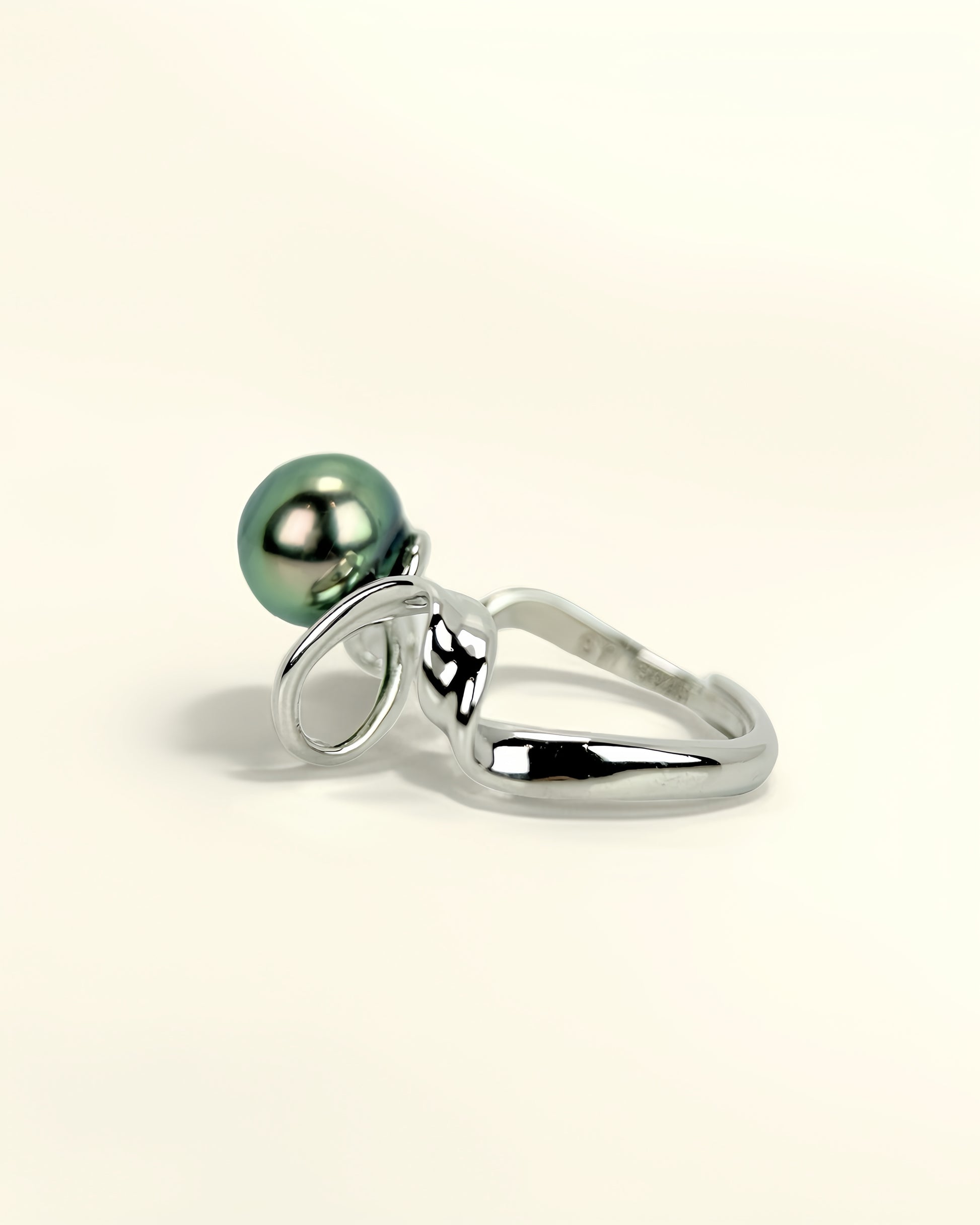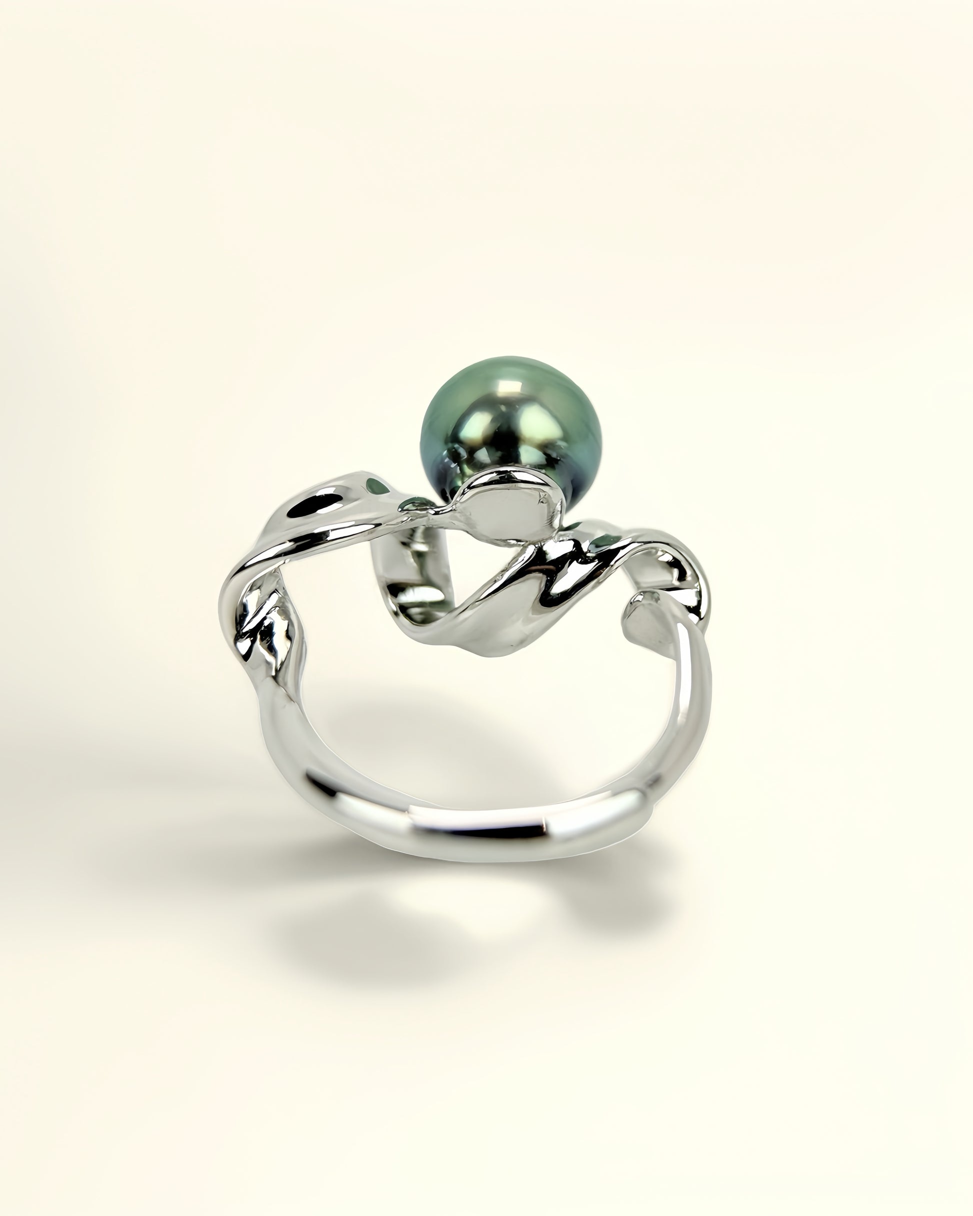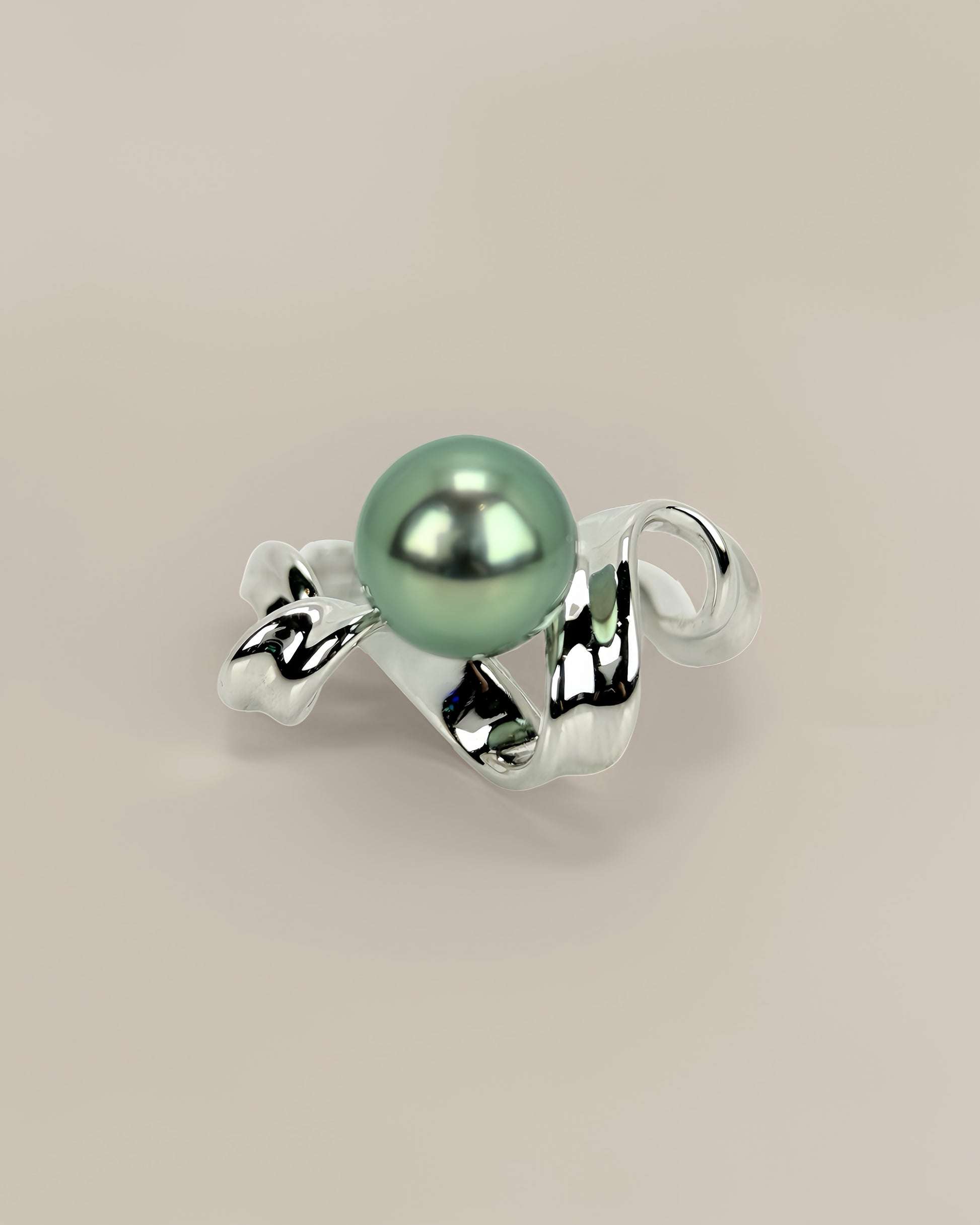 A 9.1 mm Tahitian pearl rests gently within mirrored ribbons of metal, evoking the dance of moonlight on still water.