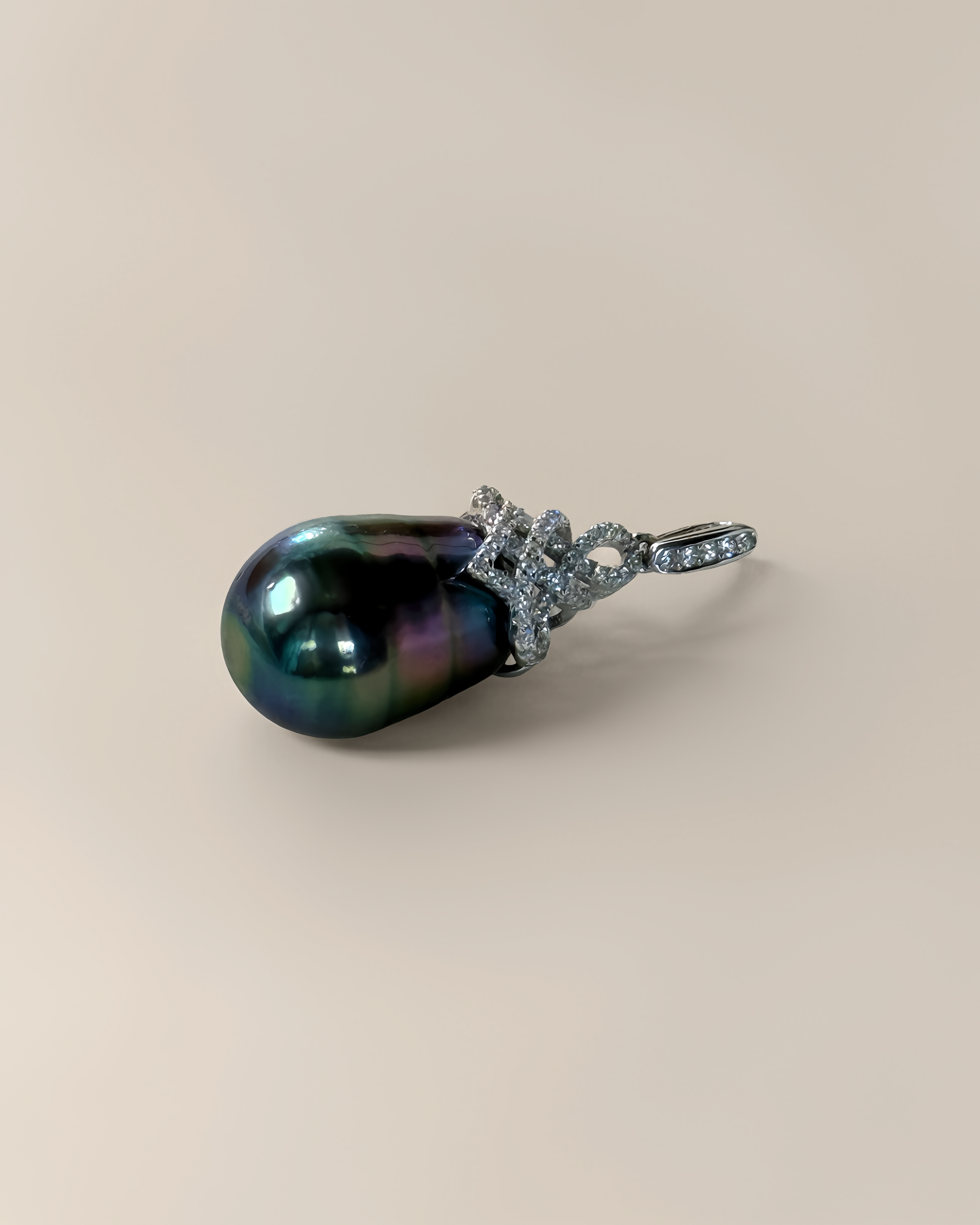 Iridescence Drop features a spectacular 12.6×17mm natural Tahitian pearl, with breathtaking rainbow hues shimmering across its deep surface: greens, violets, pinks, golds — a galaxy in every glance.