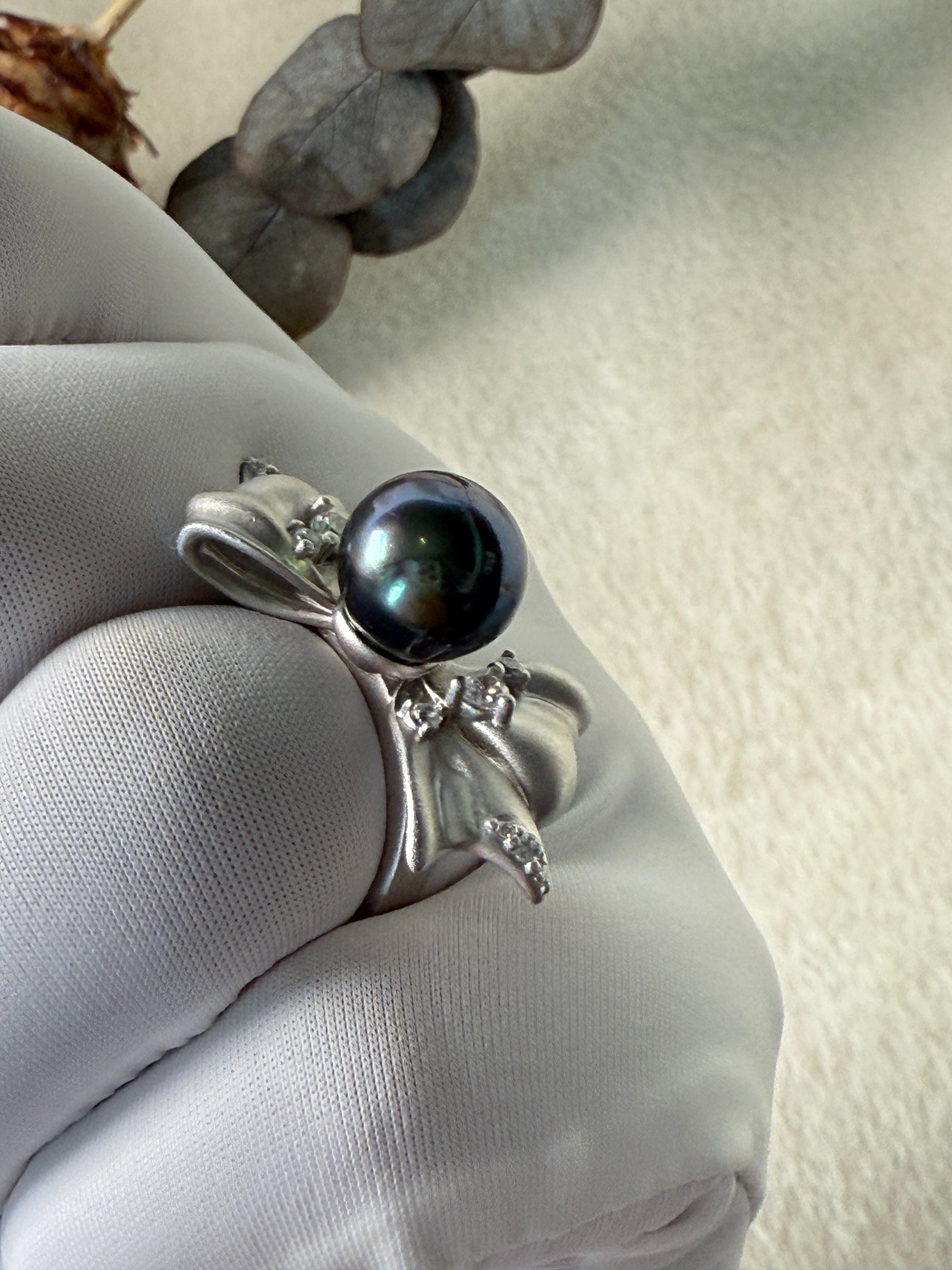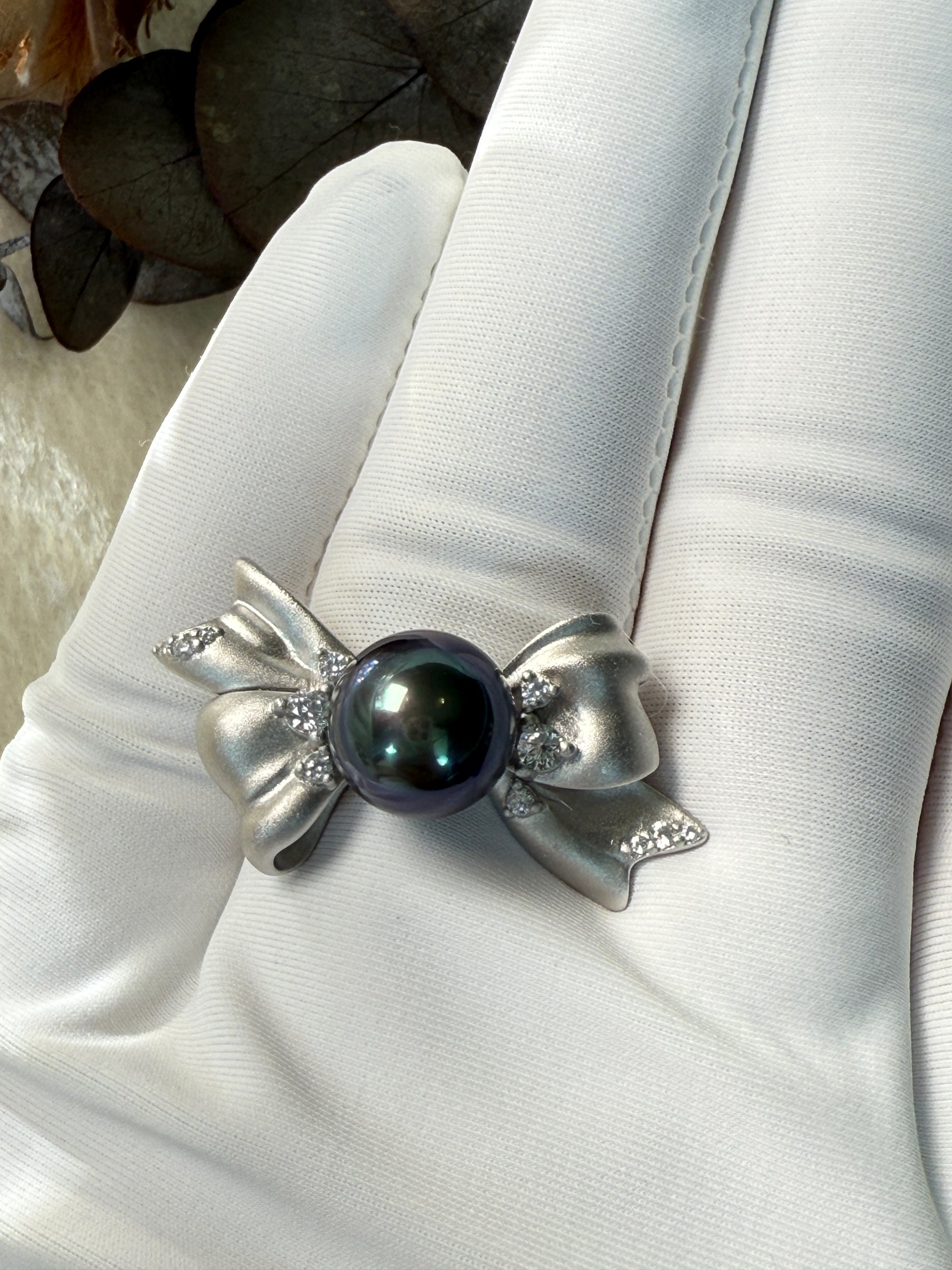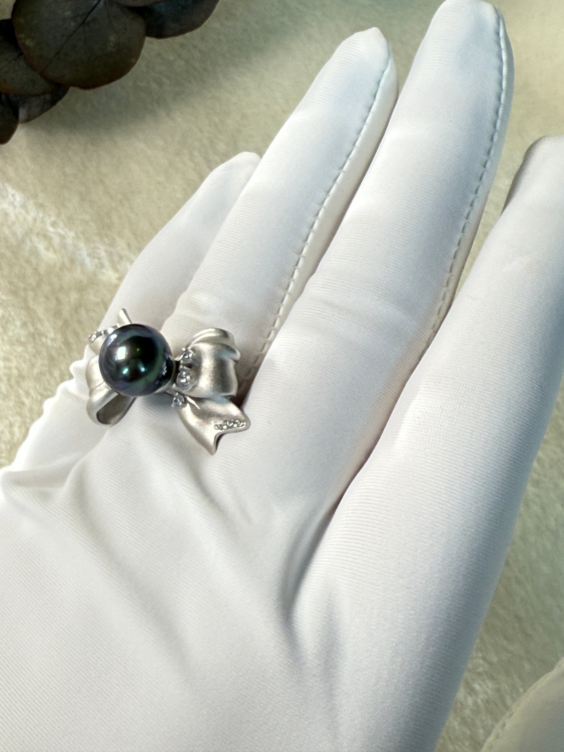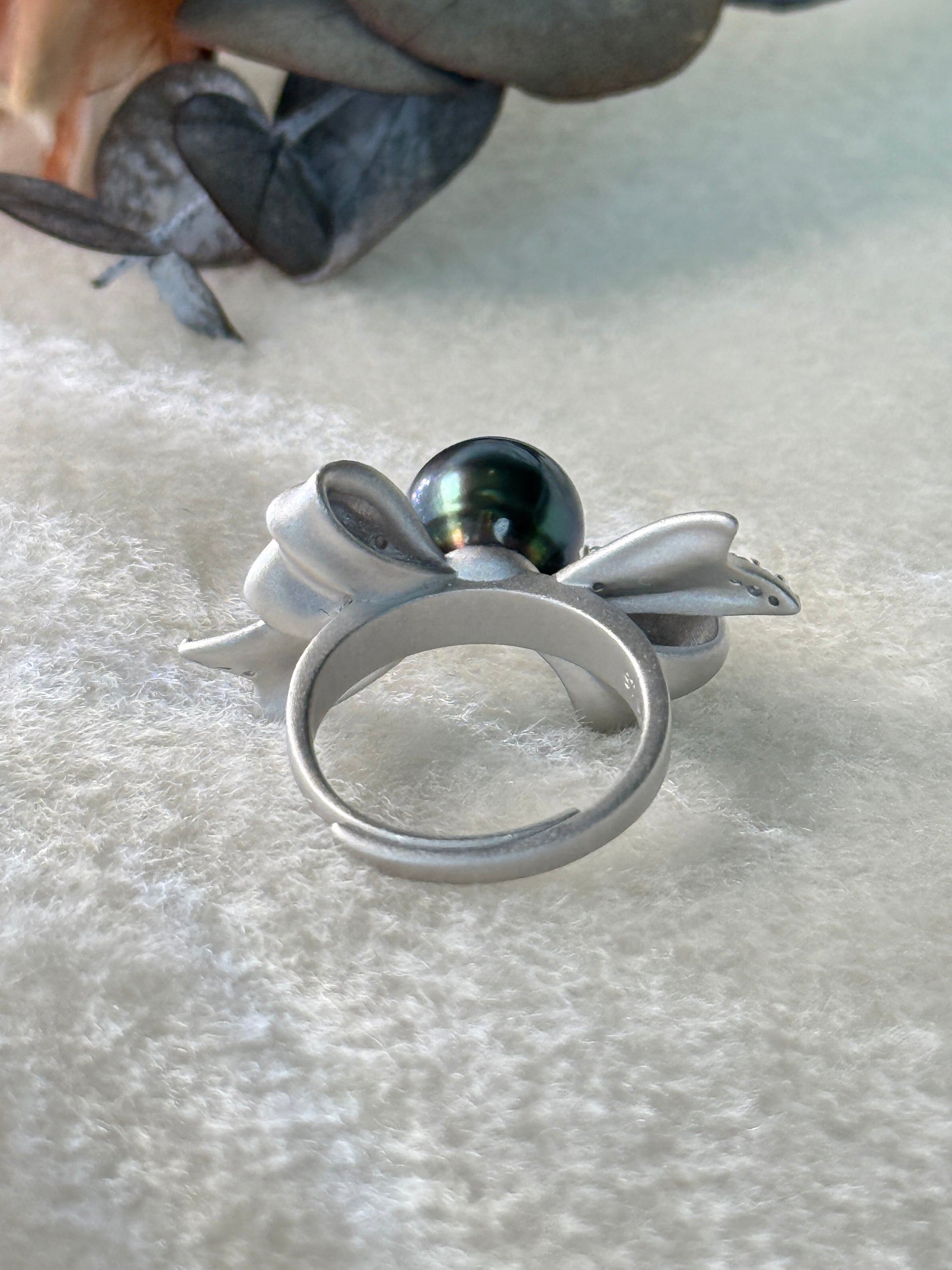 At its center rests a 9.8mm natural Tahitian pearl, glowing with deep green and peacock tones, nestled in a sculptural satin-finished 925 sterling silver bow.