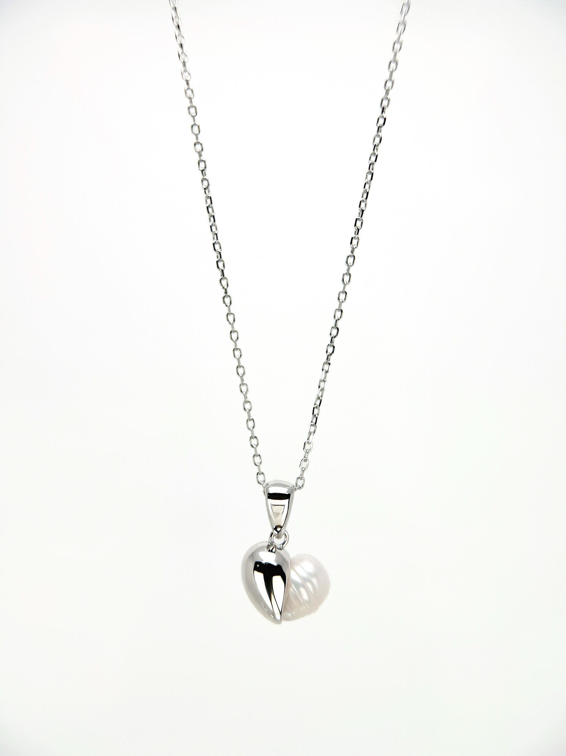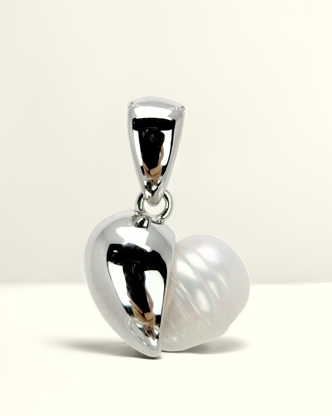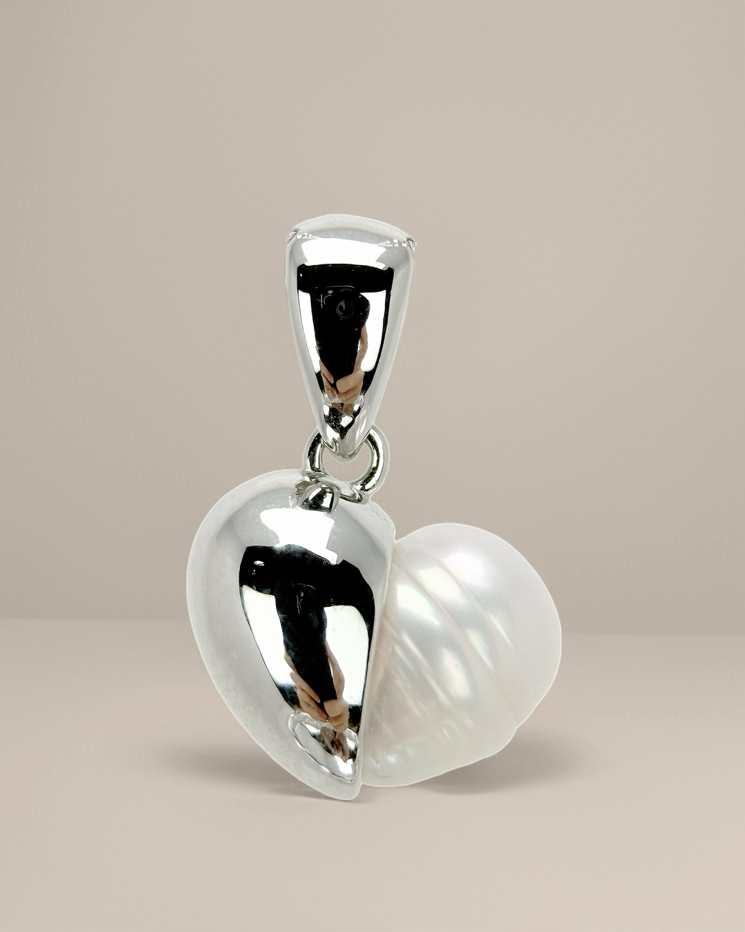 LUMÉA is balance made visible — half heart in luminous pearl, half in mirrored silver.