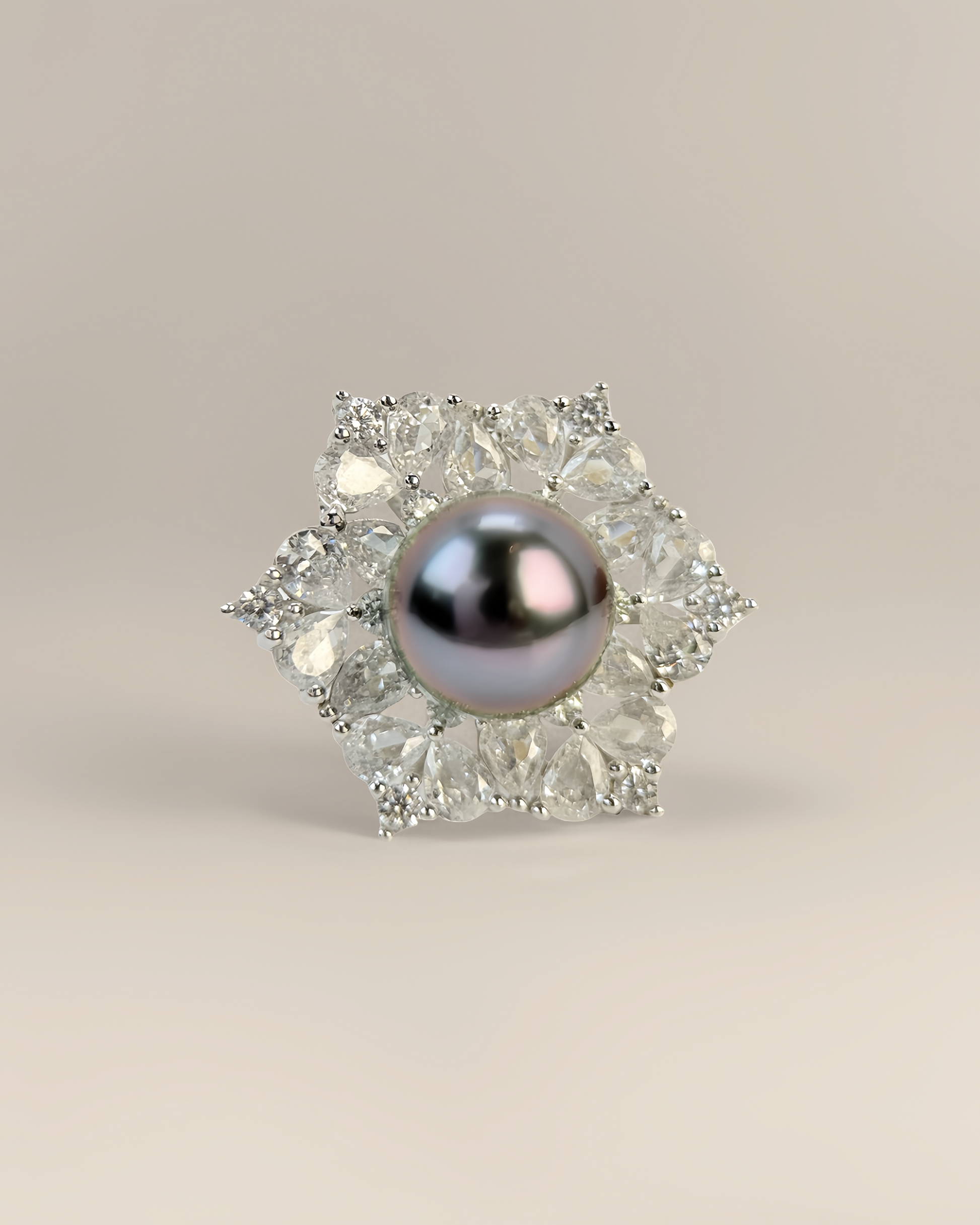 At its heart lies a 10mm natural Tahitian pearl with rare violet iridescence, glowing like twilight snow touched by dusk. Encircled by scintillating zirconia in a snowflake halo, it captures the fragile splendour of winter nights — fleeting, luminous, and profound.
