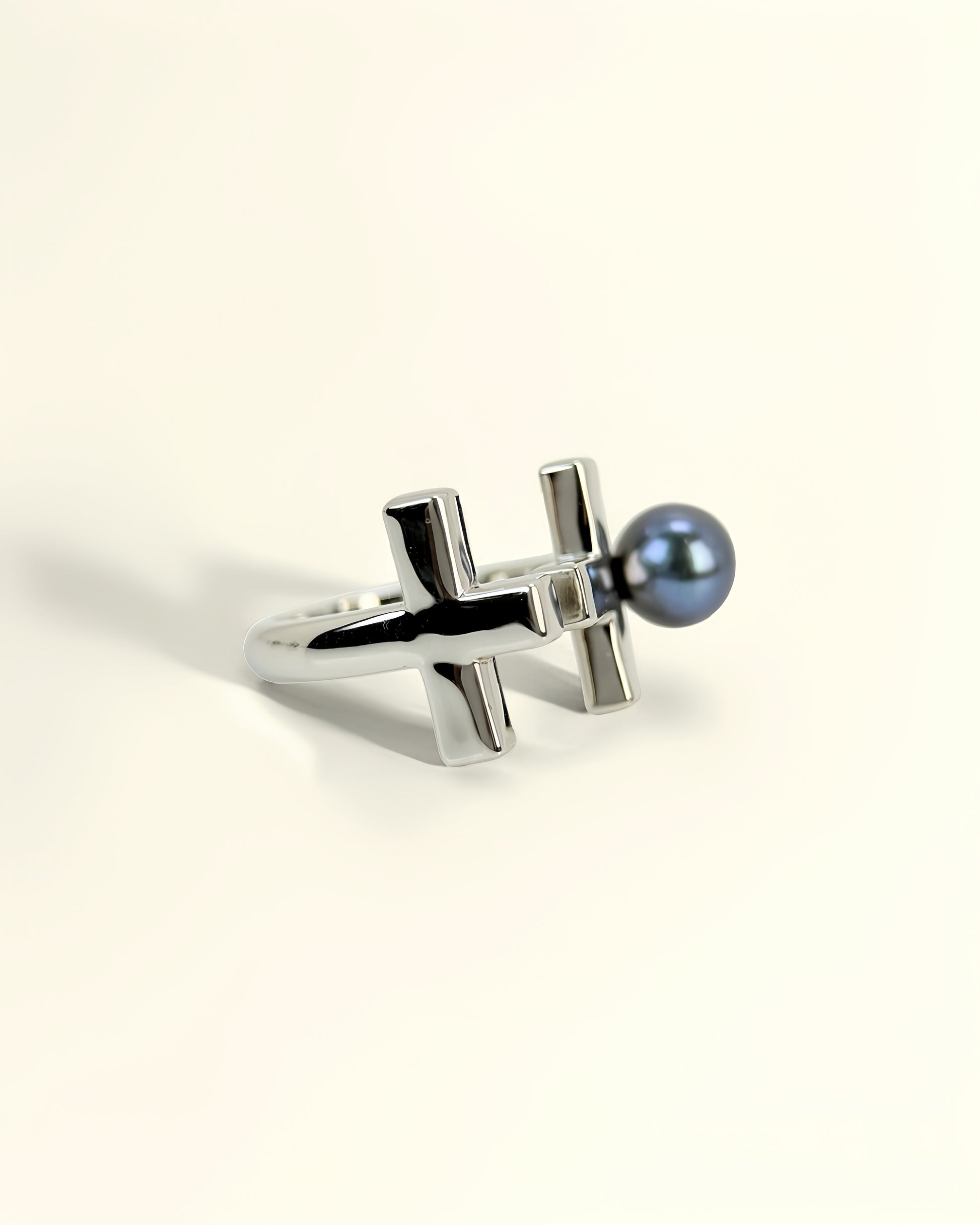 The twin-cross design, cast in 925 sterling silver plated with 18K white gold, speaks in lines of modern precision.