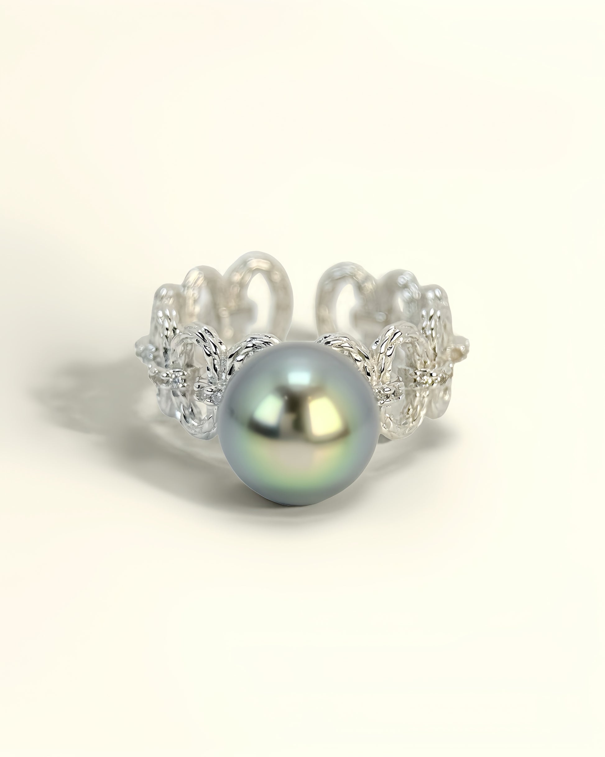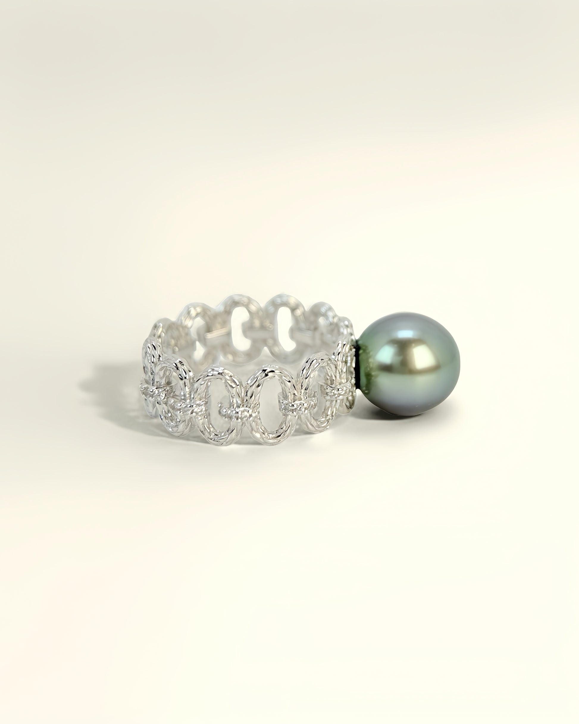 Centred by a 10.0 mm Tahitian pearl with green overtone, Virelle reflects the cool poise of a moonlit garden wall, where flowers and vines intertwine in silver stillness. The Victorian-inspired lattice shimmers softly — a dialogue between nature and craft.